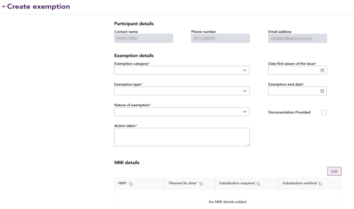 Under Exemption details, provide information in the fields. Participant details are automatically populated based on the Participant ID. If the Documentation provided checkbox is selected, supporting documentation with the allocated exemption number must be sent to meter@aemo.com.au.