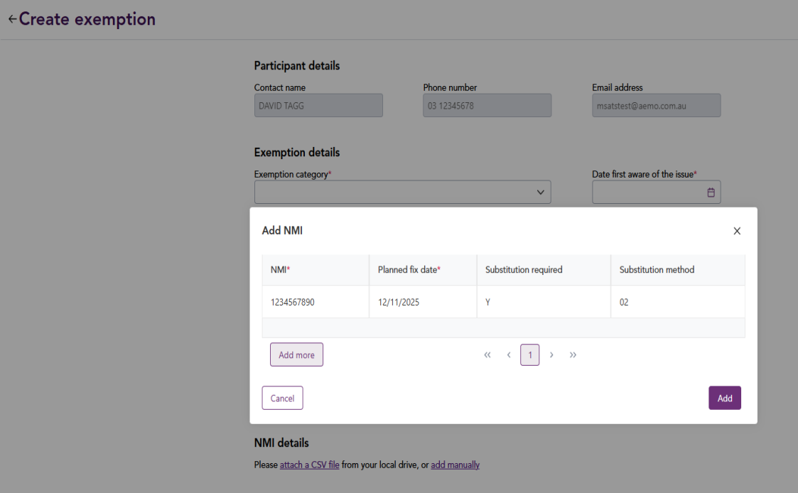 Click Add manually. In the Add NMI pop-up screen, enter the NMI details in the provided fields. Click Add more to add more NMIs, then click Add. For help, see Add NMI.