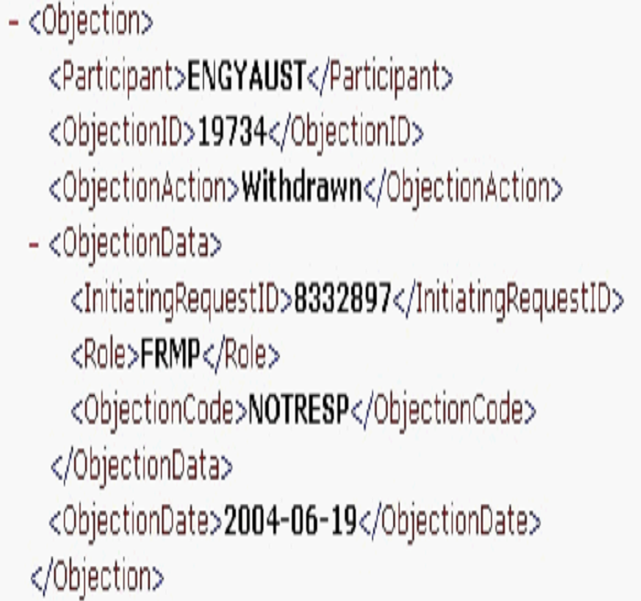 When MSATS sends a Notification for an Objection or Objection Withdrawal, along with the usual information, it has a section describing the Objection with: