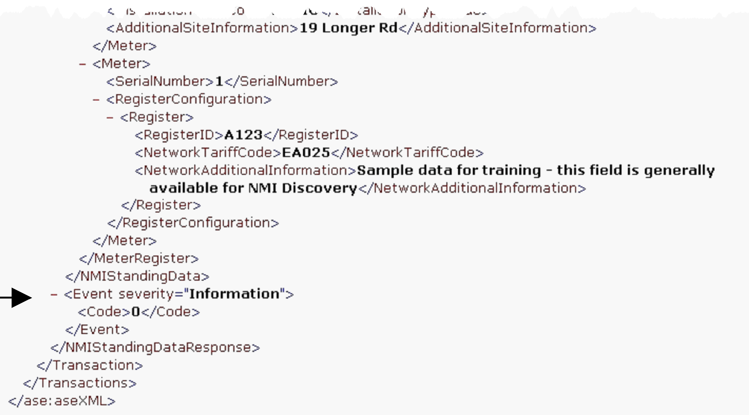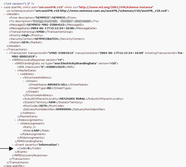 The MSATS Market Settlement and Transfer Solutions. The procedures published by AEMO under clause 7.2.8 of the National Electricity Rules, which include those governing the recording of financial responsibility for energy flows at a connection point, the transfer of that responsibility between market participants, and the recording of energy flows at a connection point. generated aseXML A standard for energy transactions in XML. A set of schemas and usage guidelines that define how data should be exchanged under FRC in the gas and electricity industries in Australia. response file has (see figure below):
