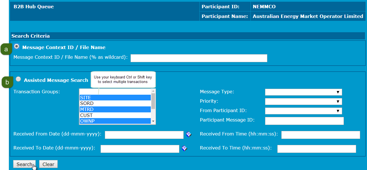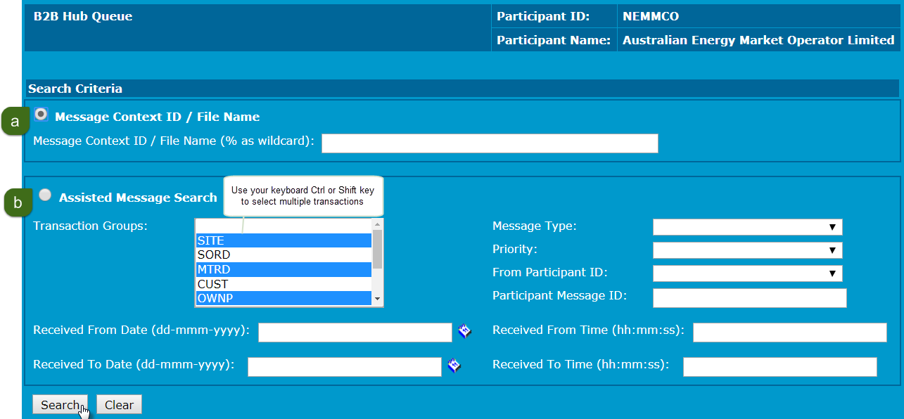 - Assisted Message Search: Used to search for specific criteria: Transaction Group, Message Type, Priority, Participant ID, and received dates.