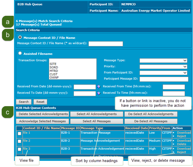 - B2B Hub Queue Contents. Displays the list of files that match your search criteria so you can view, reject, or delete messages.