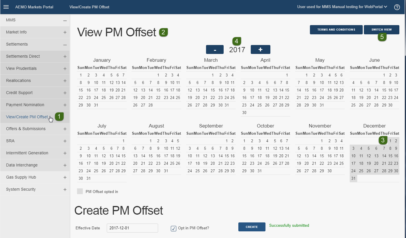 - Login to the Markets Portal and select MMS > Settlements > View/Create PM Offset.