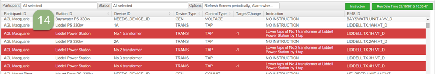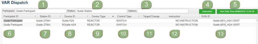 The VAr Dispatch web interface displays the latest instructions issued by the VAr Dispatch Scheduling System (VDS VAr Dispatch Scheduling; the system that produces instructions for reactive plant), illustrated in VAr Dispatch web interface and Non conforming devices. VAr Dispatch interface elements explains the information in the interface.
